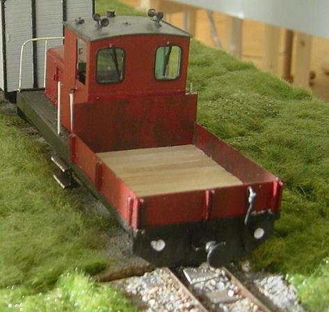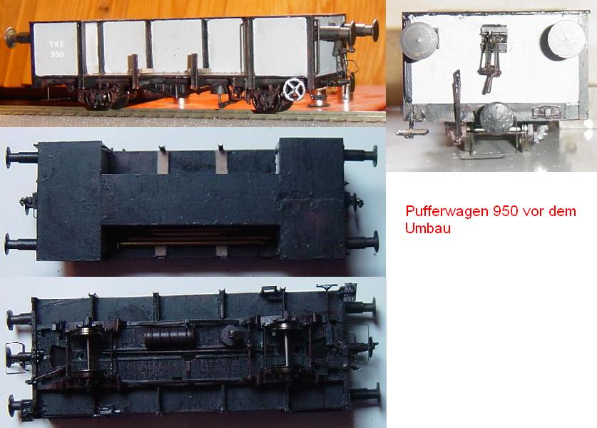 | Der Pufferwagen 950 wird zur Beförderung aufgeschemelter Regelspurwagen benutzt. Auf einem MT-Fahrgestellwurde der neue Wagenkasten aus Polystyrol- platten aufgebaut. Er wurde beschwert, um von aufgeschemelten Wagen nicht aus dem Gleis gedrückt zu werden. Da mir die Regelspurpuffer und -kupplungen mehrere Millimeter zu hoch geraten sind, weil ich beim Bau von einem falschen Maß ausgegangen bin, und weil ich dem Begleitpersonal ein Dach über dem Kopf spendieren wollte, habe ich mich dazu entschlossen, den Wagen umzubauen. Ich habe daher alles über dem Wagenboden abgeräumt und einen neuen Wagenkasten gebaut. Die beiden Kästen, die die Regelspureinrichtungen tragen wurden niedriger gemacht und wieder eingebaut. Dazwischen kam ein Aufenthaltsraum. Da der Wagen auch künftig keinen Laderaum hat, wurde er auch nicht als Packwagen genummert, sondern wird weiterhin unter seiner bisherigen Dienstwagennummer eingereiht bleiben. Hier kann man den Zustand vor dem Umbau betrachten. | |