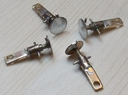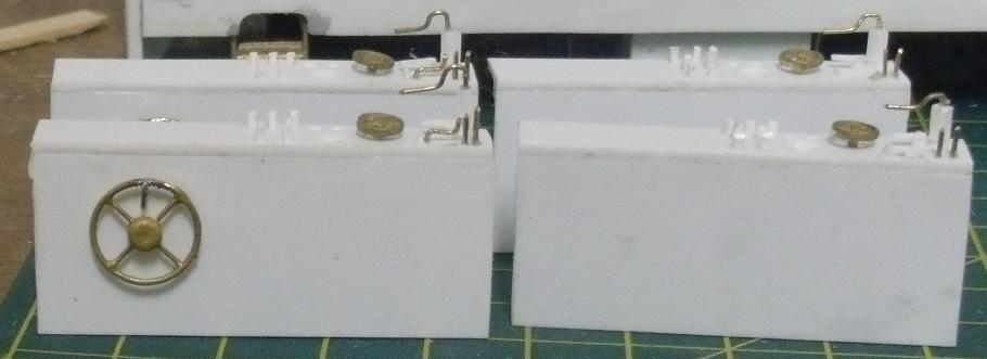 | Hier sind schon mal die neuen Mittelpuffer für die Zwillinge. Nachdem mir ja von mehreren Trichterkupplungen, die ja leider aus Kunststoff sind, die Köpfe abgerissen sind, was mir allerdings bei den Kupplungen, die bei diesen beiden Maschinen verbaut waren, nicht passieren könnte (siehe drei Reihen weiter oben). Nun war bei einer Kupplung das dünne Stiftchen oben drauf, in den Kupplungsbügel eingehängt werden können, abgebrochen, außerdem war es jedes Mal ein Gehake und Gewürge, wenn man den Lokkasten herunternehmen wollte. Daher war fiel mir der Entschluß leicht, wieder generell zu meinen eigenen Mittelpuffern zurückzukehren. Ich habe diese schon vorbereitet. Im Lokkastenrahmen direkt hinter der Pufferbohle werden diese nun schwenkbar gelagert | |