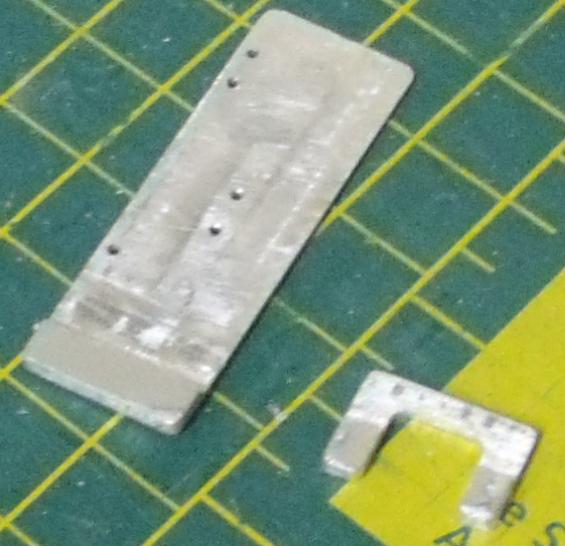 Für die Aufstiege habe ich mir eine Lehre gebaut, um die Aussparungen in der seitlichen Verkleidung anzubringen (rechts unten). Außerdem entstand eine Lehre, um die Griffstangen gleichmäßig Biegen und die Aufnahmelöcher bohren zu können (links). Die Biegelehre ist in der Mitte. Die Stange wird an einem Ende um 90° abgewinkelt, je nach gewünschter Länge in eines der beiden Löcher gesteckt und über die obere Kante erneut umgebogen. Die Bohrlehre befindet sich am linken Rand. in unteren Bereich ist ein Anschlag, den ich passend zu den Zwillingen stehen lassen habe. Für andere Fahrzeuge ist dieser Anschlag nicht unbedingt an der richtigen Stelle, aber man kann sich dafür ja einen neuen Anschag an die passende Stelle kleben. |