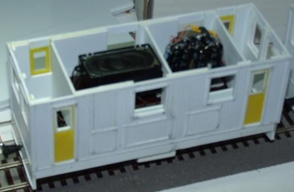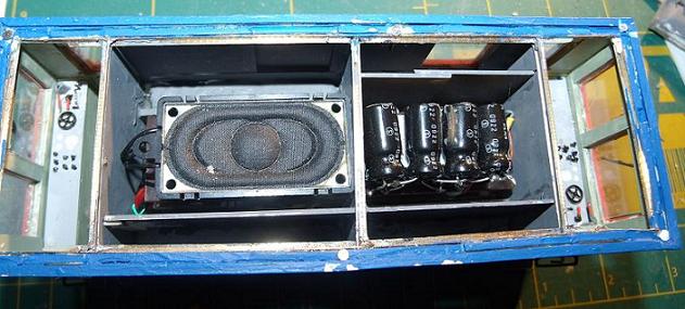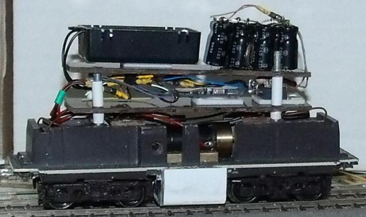 | Im Inneren werkelt in Verbindung mit einem Maxxon-Glockenankermotor ein Sounddecoder von ESU samt großem Lautsprecher und Speicherbaustein von Kalle Stümpfl. Aufgebaut sind die Maschinen auf Fahrwerken der H0-V100 von Roco. In die Löcher für die Platinenbefestigungsschrauben habe ich vier Gewindestangen M3 eingeklebt. Durch aufgeschobene Abstandsbuchsen werden zwei Pertinaxplatten auf Distanz gehalten. auf der unteren Platte befindet sich der Decoder und die Vorschaltelektronik für den Speicher (damit beim programmieren und auslesen trotz Speicher kein Kurzschluß angezeigt wird). Auf der oberen Ebene befinden sich Lautsprecher und Speicher. | |