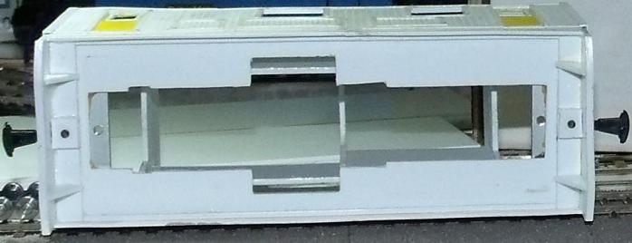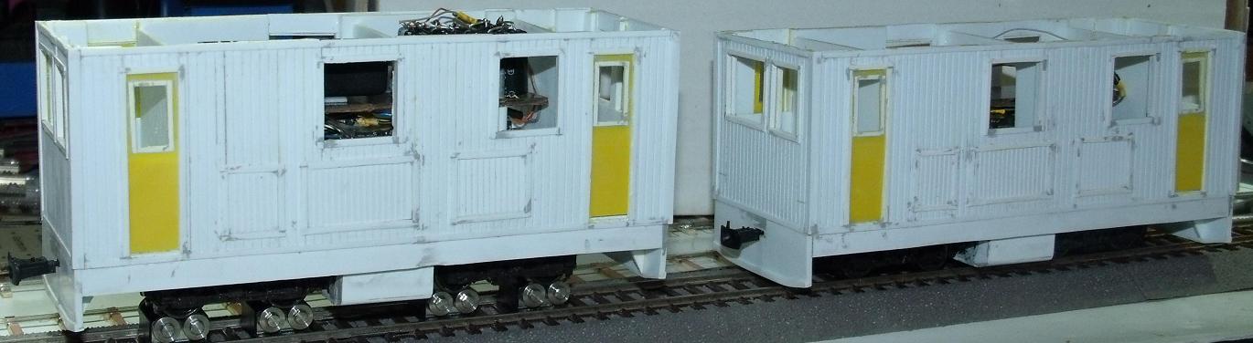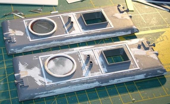 Vorne das Dach von WB1 und hinten das von WB2. Die Dächer haben Einfassungen für Dachsegmente erhalten, die einzeln abhebbar sind, um Großbauteile, wie Dieselmotor, Getriebe usw. herausheben zu können Die Lüftergitter entstanden aus einem geätzten Lochblech. Die Auspuffrohre sind aus Kunststoff, wobei ich die oberen Enden noch aufgebohrt habe, weil die Wandstärke doch ziemlich groß war. Die viereckigen Aufsätze bekommen noch Klappen. Die Lampen habe ich ebenfalls aus Kunststoffrohr gebaut, wobei innen ein weiteres Kunststoffrohr etwas zurückgesetzt eingeklebt wurde, welches als Anschlag für das Lampenglas dient Zum Geben akustischer Signale wurden pro Seite je ein Hoch- und ein Tieftöner eingebaut, sowie pro Lok ein Druckluftläutewerk. Da ich von vorneherein vorhatte, gewisse Unterschiede einzubauen, sitzt das Läutewerk von WB1 hinter den Pfeifen, das von WB2 daneben. Die Farbe ist ein Kontrollanstrich, um zu schauen, wo ich noch nachschleifen oder nachspachteln mußte. |