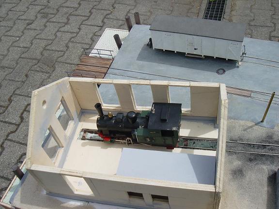 steht die Lok 3 im Schuppen. im Vordergrund des Schuppens