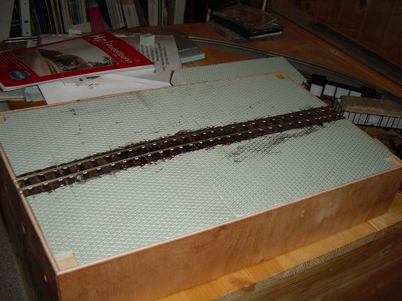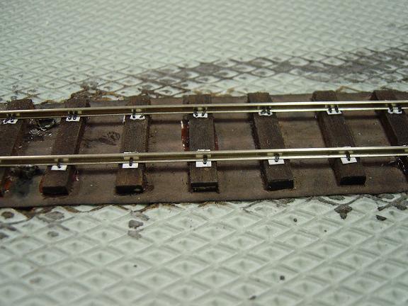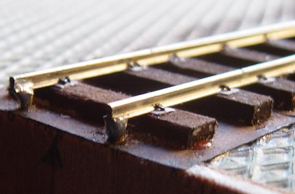 | Das Gleis besteht aus Code 83-Schienen, die ich mit Schienennägeln auf Holzschwellen genagelt habe. Das Gleisende am Modulstoß habe ich zur Sicherheit gegen abreißen auf kleine Messigschrauben gelötet. | |