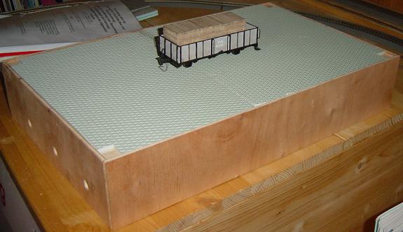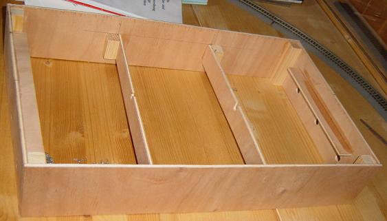| Der Rahmen besteht aus 5mm-Sperrholz und wurde mit Hilfe von Eckversteifungen komplett verleimt. Die Spanten und Auflagen an den Stirnbrettern sind in der Höhe auf die Hartschaumplatte abgestimmt. Diese Hartschaumplatte versteift das Modul ungemein und gibt dem Ganzen eine gute Stabilität. | |